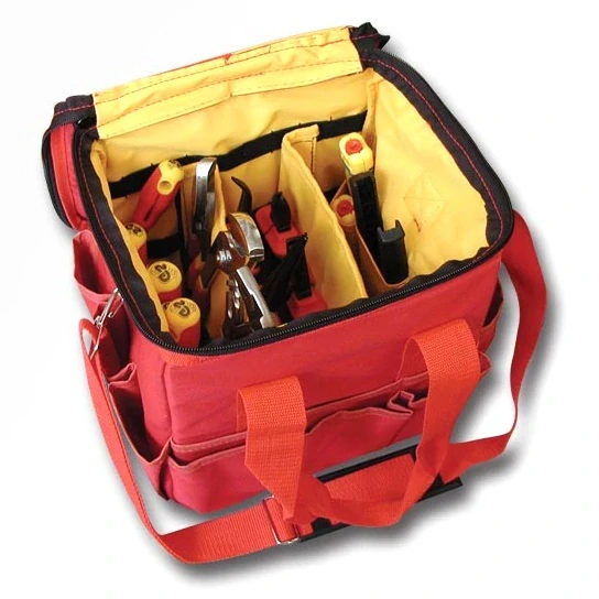 Elektrikářská sada nářadí v lehké a praktické textilní brašně. Otevírací horní strana a oddělené přihrádky s oky pro každý kus nářadí umožňují přehledné uložení. 18 úložných kapes po celém obvodu brašny. Vyztužené dno, boky, víko i přihrádky. Nastavitelný popruh přes rameno. Univerzální brašna plná nářadí vhodných pro mnoho profesí.