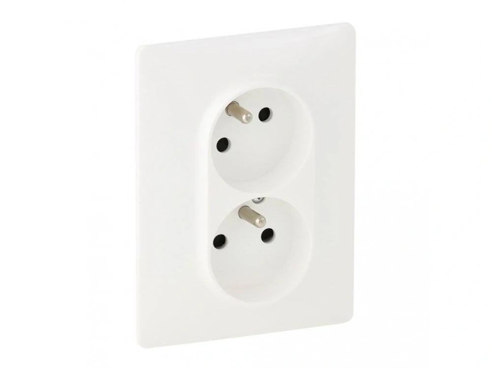 Dvojzásuvka s horní zásuvkou pootočenou o 30°. Kompletní produkt s krytem a rámečkem. Automatické svorky.